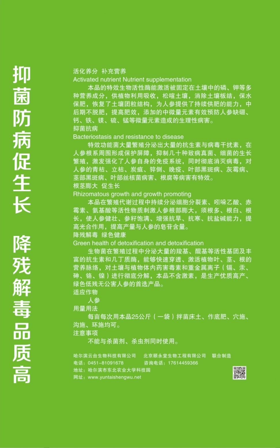 本品的特效生物活性酶能激活被固定在土壤中的磷、钾等多种营养成分,供植物利用吸收,松喧土壤,消除土壤板结,保水保肥,恢复了土壤团粒结构,为人参提供了持续供肥的能力,中后期不脱肥,提高肥效,添加的中微量元素有效预防人参缺硼、钙、铁、镁、硫、锰等微量元素造成的生理性病害。